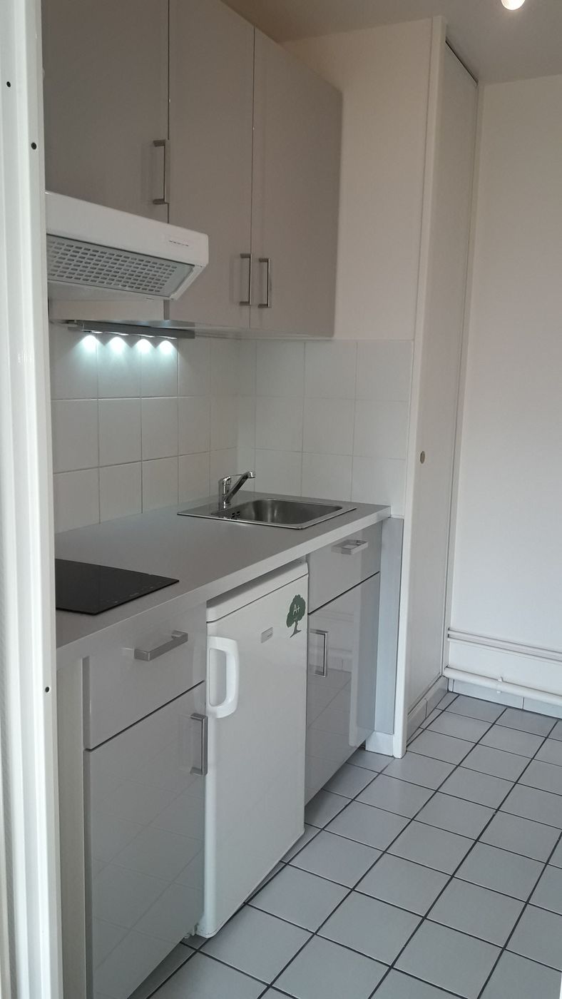 au 1er étage de la résidence avec ascenseur, rue Boulard, agréable appartement donnant sur jardin, composé d'une entrée avec placard, une pièce principale et une cuisine, séparée, aménagée et équipée de plaques de cuisson, hotte et d'un réfrigérateur, une salle de bains/toilettes.
